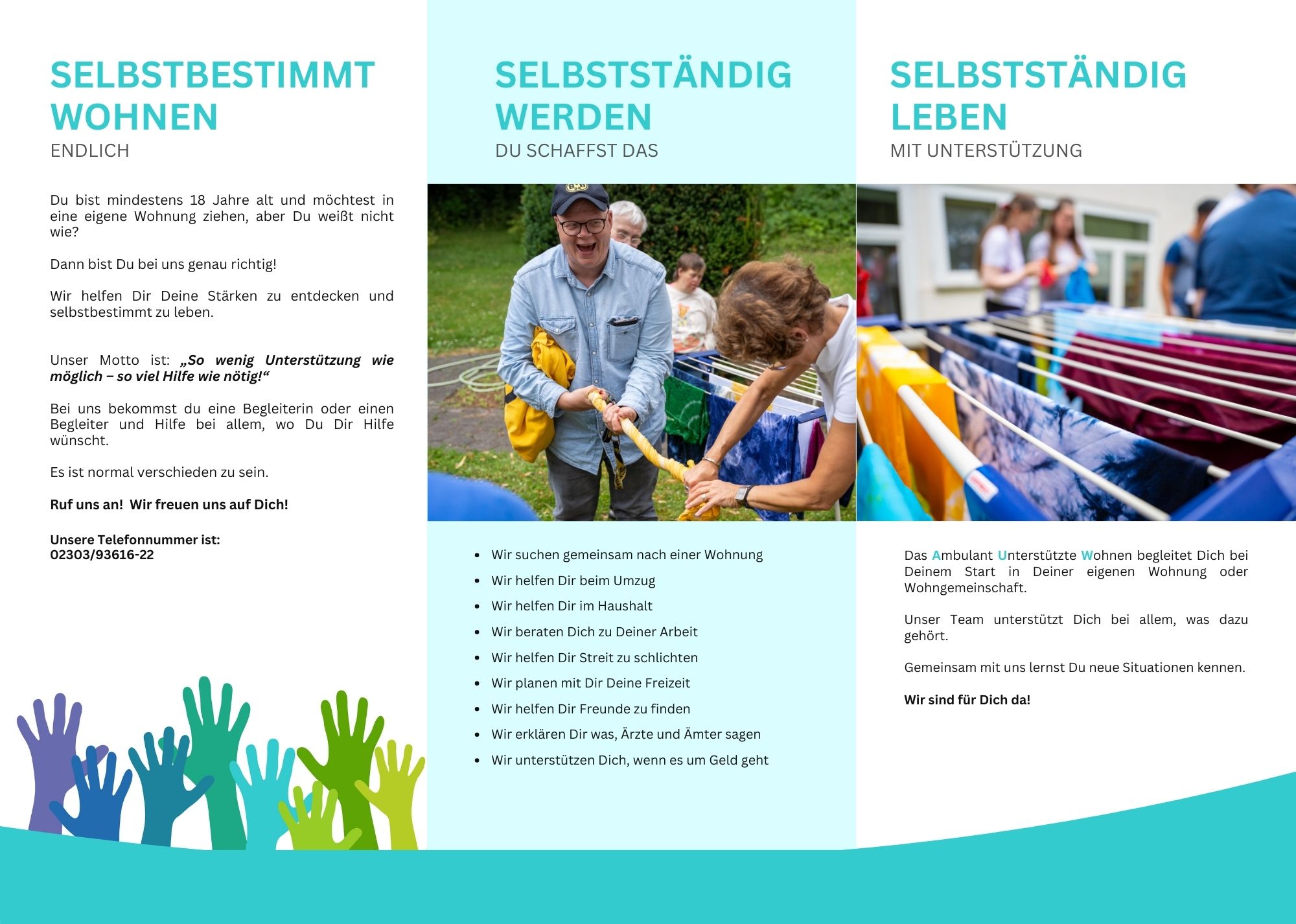 Das Ambulant unterstützte Wohnen ist in den letzten Jahren immer beliebter geworden. So bietet die Lebenshilfe Kreis Unna e.V. Menschen mit Beeinträchtigung ab 18 Jahren das Ambulant unterstützte Wohnen an. Hierbei handelt es sich um ein Unterstützungsangebot, dass Menschen mit verschiedenen Beeinträchtigungen hilft auf eigenen Füßen zu stehen, sie aber in manchen Bereichen auf Beratung, Unterstützung und intensive Förderung angewiesen sind. Getreu dem Motto: „So wenig Unterstützung wie möglich – so viel Hilfe wie nötig!“
